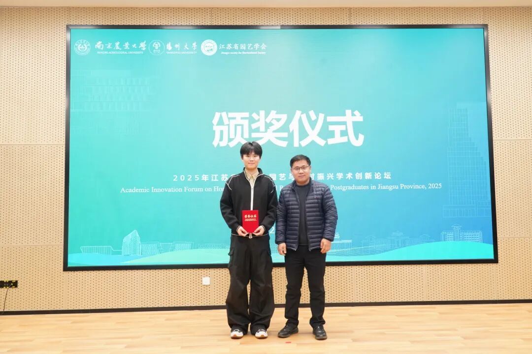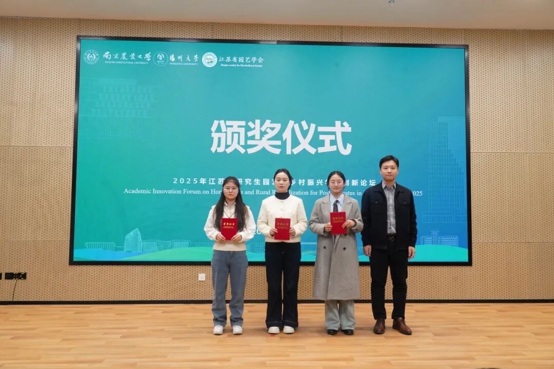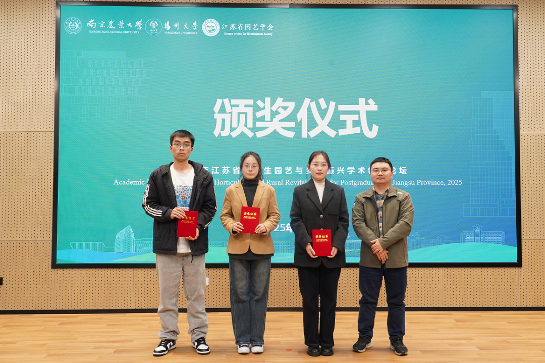 研究生辅导员骆迎澳公布本次论坛汇报交流的获奖名单,冯立国、束浩渊、陶书田、王振兴为获奖学生颁奖,并对广大园艺研究生寄予殷切期望。他们鼓励同学们以本届论坛为新起点,将交流中收获的真知灼见转化为科研动力,主动搭建学术共享桥梁,带动更多园艺学子深耕专业领域,在学科交叉中凝聚创新合力,让学术思维的火花持续迸发,在服务国家农业发展与美好生活需求的征程中,书写园艺学科的青春篇章。