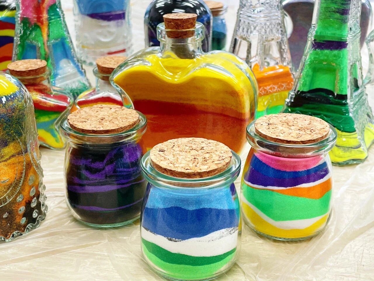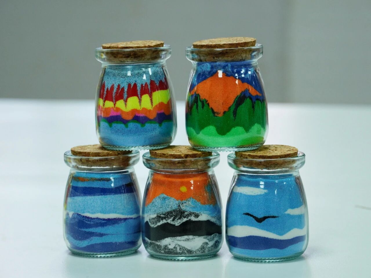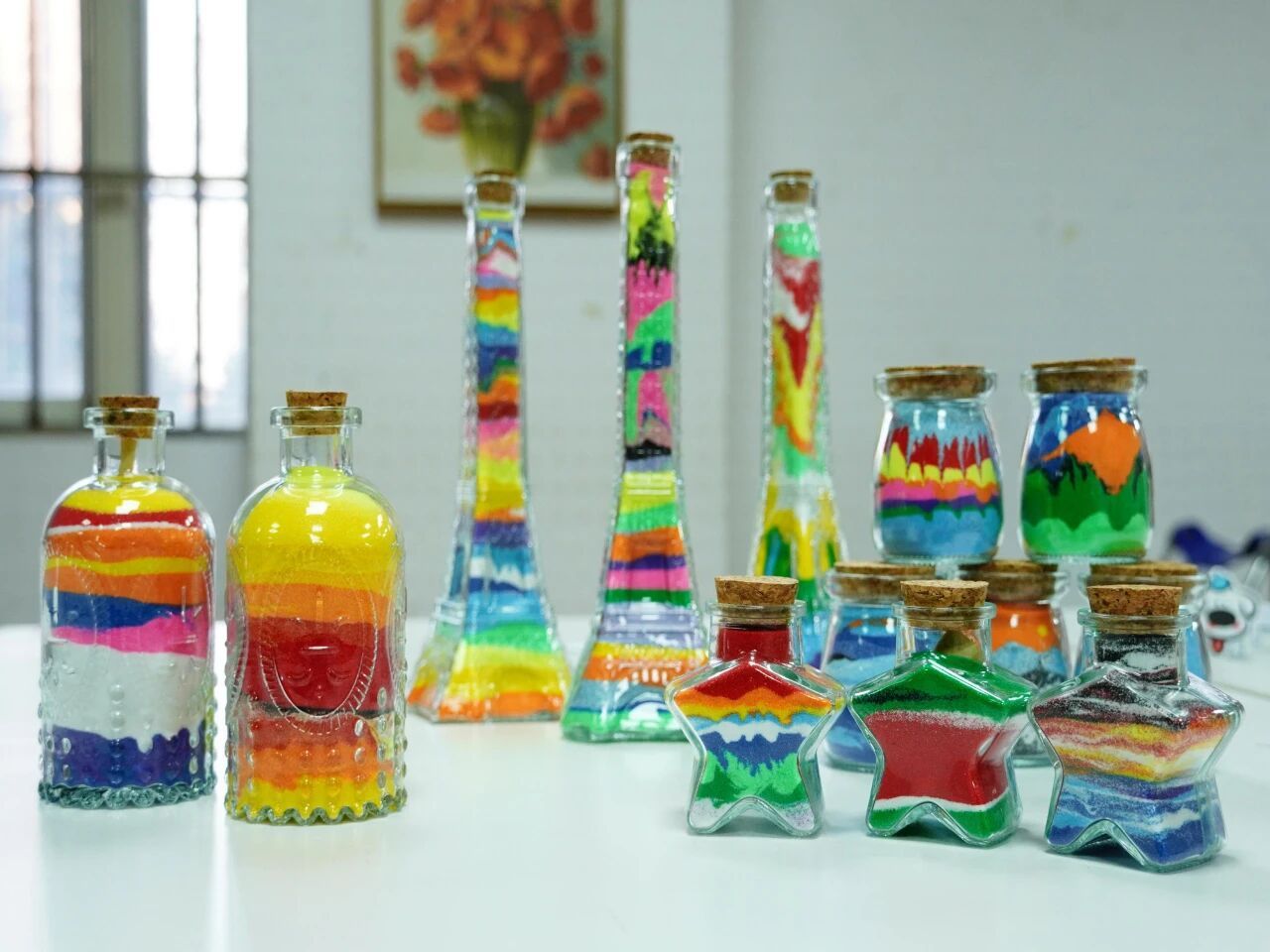 在“沙画许愿瓶”创作环节中,各类形状的透明玻璃瓶化身为同学们心灵的画布,五彩斑斓的砂粒则成为他们勾勒美好梦想的画笔。同学们全神贯注地往瓶中倾倒、堆砌各色细砂,再借助工具进行细致操作,一幅幅生动活泼的画面便逐渐成形:有翱翔于蔚蓝海面上的沙鸥,自由而灵动;有夕阳余晖与柔美晚霞的绚烂交织,温暖而浪漫。此外,还有精致的七彩埃菲尔铁塔和彩虹星星许愿瓶,寄托了同学们对未来的美好憧憬。最后,大家将写满心愿的小纸条轻轻放入瓶中,小心翼翼地封存这份美好的愿景。