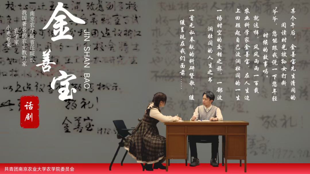 《金善宝》话剧由农学院学生自编、自导、自演,以生动的舞台演绎复现金善宝先生从立志求学、扎根小麦研究到科学报国的壮阔人生,展示了他“将论文写在祖国大地上”的精神图谱。