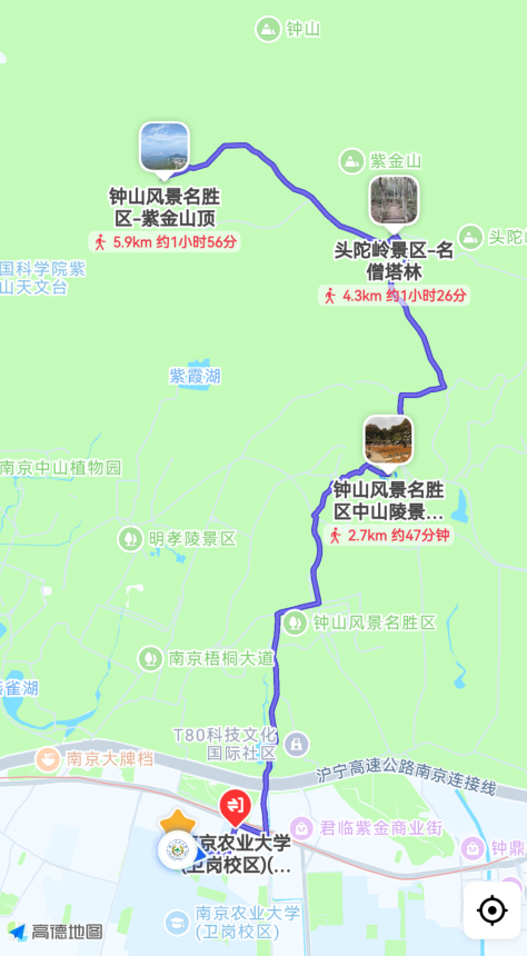 南京农业大学卫岗校区勤仁坡→中山陵停车场(起点)→中山陵景区(东门)→名僧塔林→头陀岭观景台