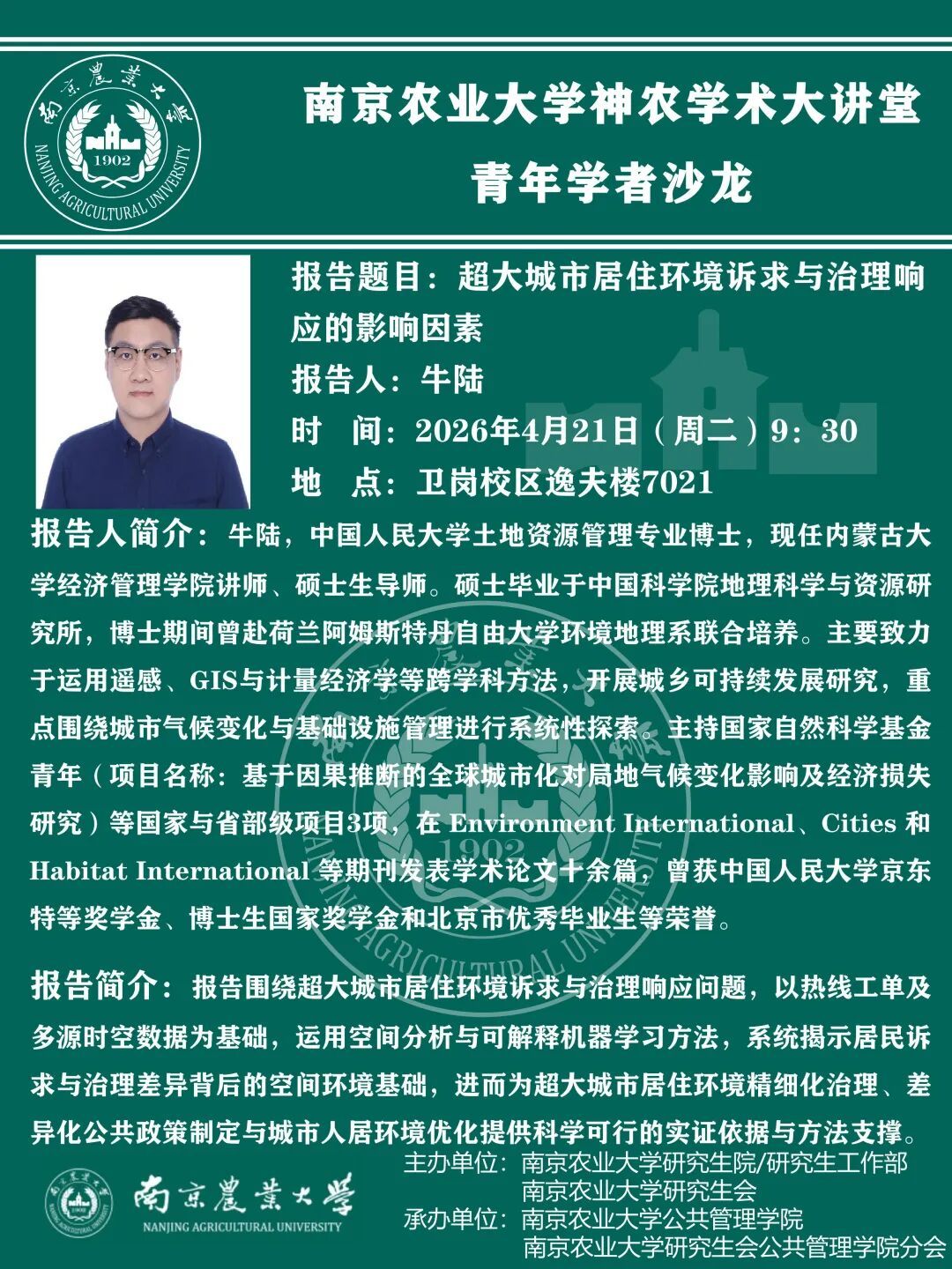 在全球城市化快速演进的背景下,超大城市居住环境的品质提升与治理精细化,已成为城乡可持续发展与人地系统优化研究的关键议题。基于此,本次活动特邀牛陆教师作题为“超大城市居住环境诉求与治理响应的影响因素”的学术报告,充分展现跨学科方法在城市治理研究中的实践价值。报告围绕超大城市居住环境诉求与治理响应问题,以热线工单及多源时空数据为基础,综合运用空间分析与可解释机器学习方法,系统揭示居民诉求与治理差异背后的空间环境基础,进而为超大城市居住环境精细化治理、差异化公共政策制定与城市人居环境优化提供科学可行的实证依据与方法支撑。