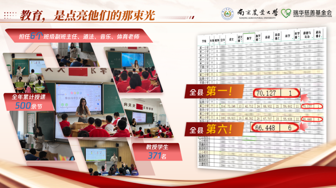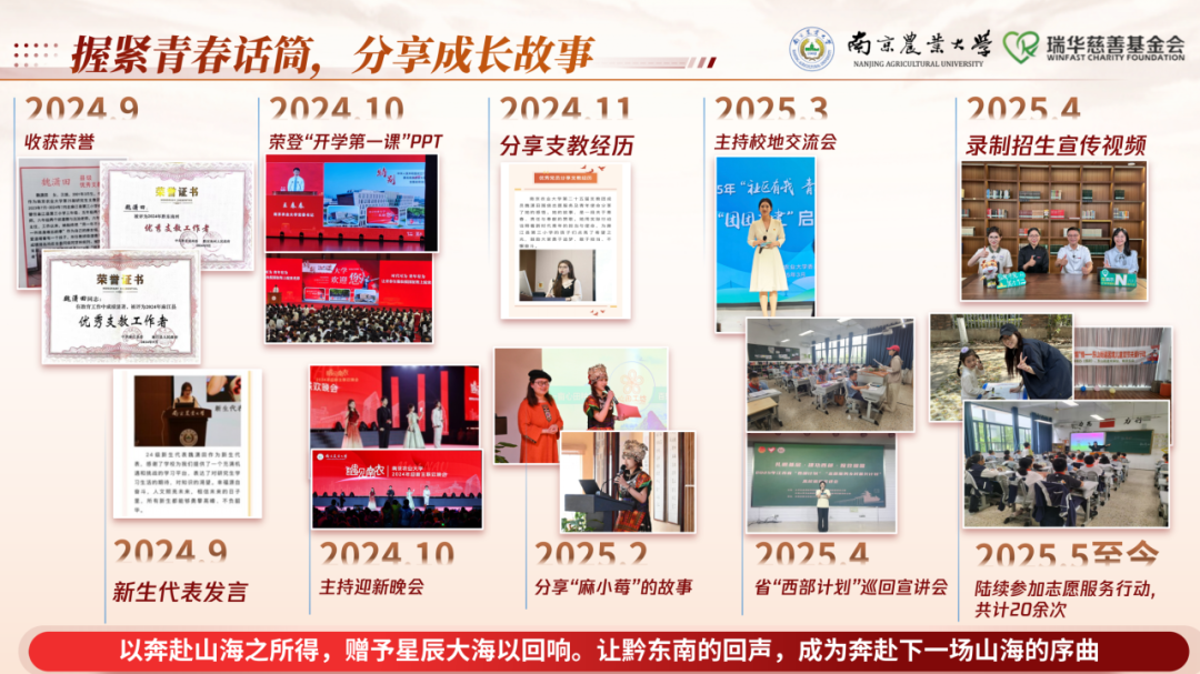 在校期间,魏潇田从未停下成长的脚步。她先后担任院、校学生会执行主席,获各类荣誉56项。身为南农学子,她参与的支教、助农事迹被中国青年网等主流媒体报道 20 余次。她常分享自己的故事,将爱与责任的种子传递给更多人。