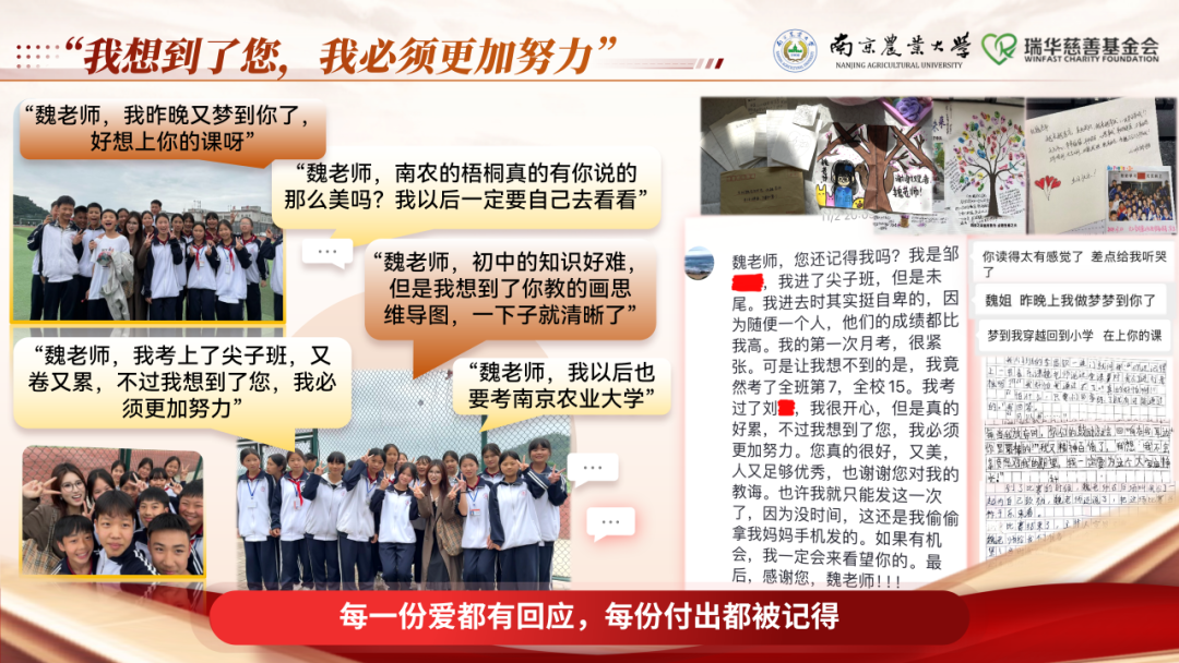 她与团队成员开展“禾苗助学” 成长计划,累计帮扶 72 名孩子,募集资金 72180 元。这些孩子多是留守儿童,沉默伴随了他们整个童年。 为此,她选择用美育来唤醒孩子们沉寂的心灵,仅一个月时间,她带领孩子们自信地站在了全县器乐比赛二等奖的领奖台上。平日里最安静的男孩冲过来抱住她:“魏老师,谢谢你教我吹竖笛,等过年爸爸妈妈回来,我一定要吹给他们听!” 那一刻,她真正懂了父亲所说的——“每一份爱都有回应,每份付出都被记得”。