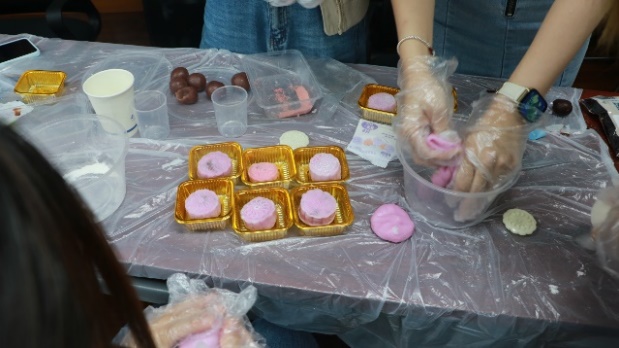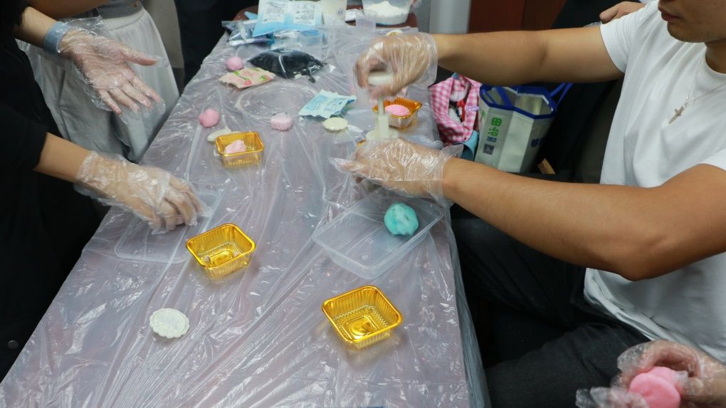 在这次中秋活动中,大家各自组队,共形成5个小组。工作人员首先在多媒体屏幕上放出冰皮月饼的制作过程,随后,每个小组的成员便开始有序协作,共同学习并完成冰皮月饼的制作。