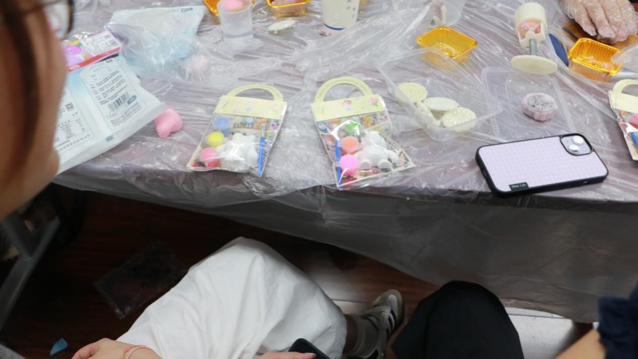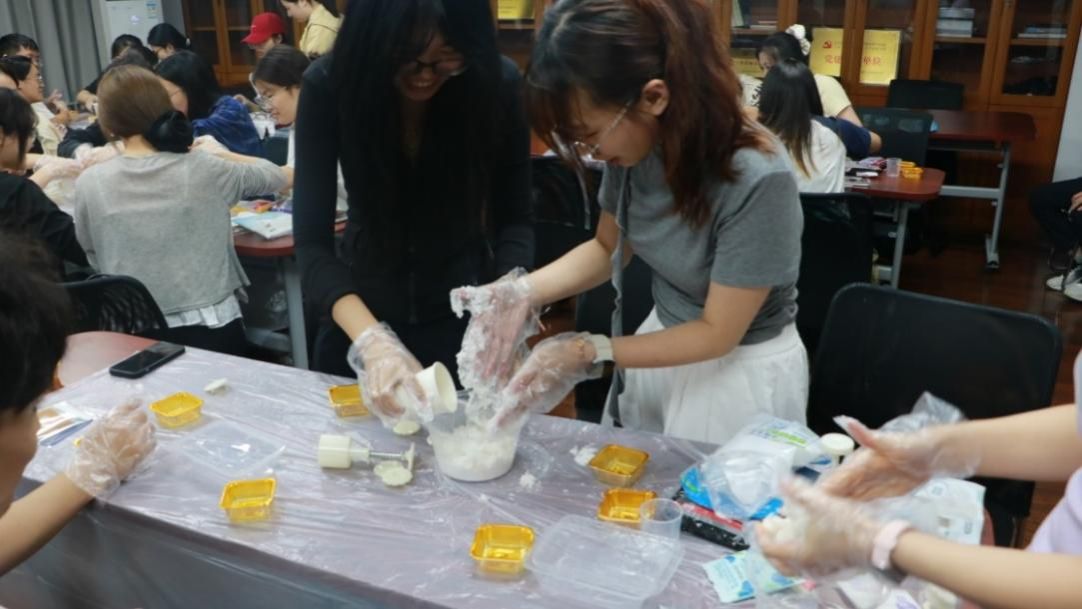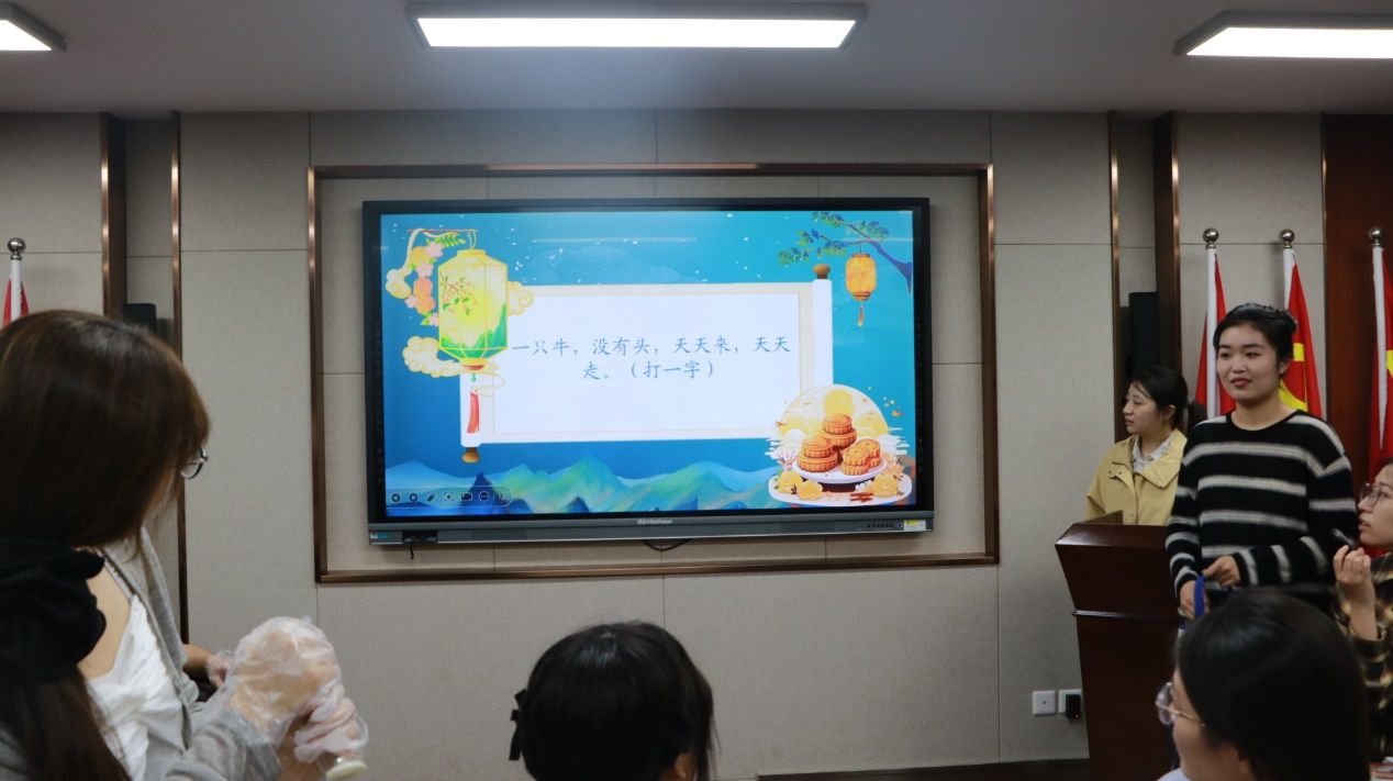 在冰皮月饼制作环节推进的过程中,猜灯谜活动同步穿插开展。工作人员提前精心筹备的灯谜题目,涵盖猜花、猜字等多种类型,与中秋时节、日常文化认知紧密关联,各小组同学积极参与。该环节不仅活跃了现场整体氛围,更让同学们在思辨中加深了对传统灯谜文化的理解,进一步丰富了本次中秋主题活动的文化内涵。