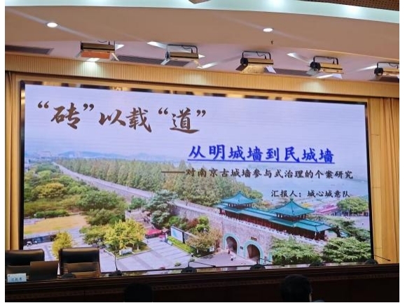 11月22日下午,决赛在连云港江苏海洋大学正式拉开帷幕。在最终的PPT汇报展示和现场答辩环节,“城心城意”队的成员们将南京古城墙从古代防御工事(“明”城墙)转变为现代城市生活中服务于人民、融入民生的公共文化空间(“民”城墙)的复杂治理历程娓娓道来。