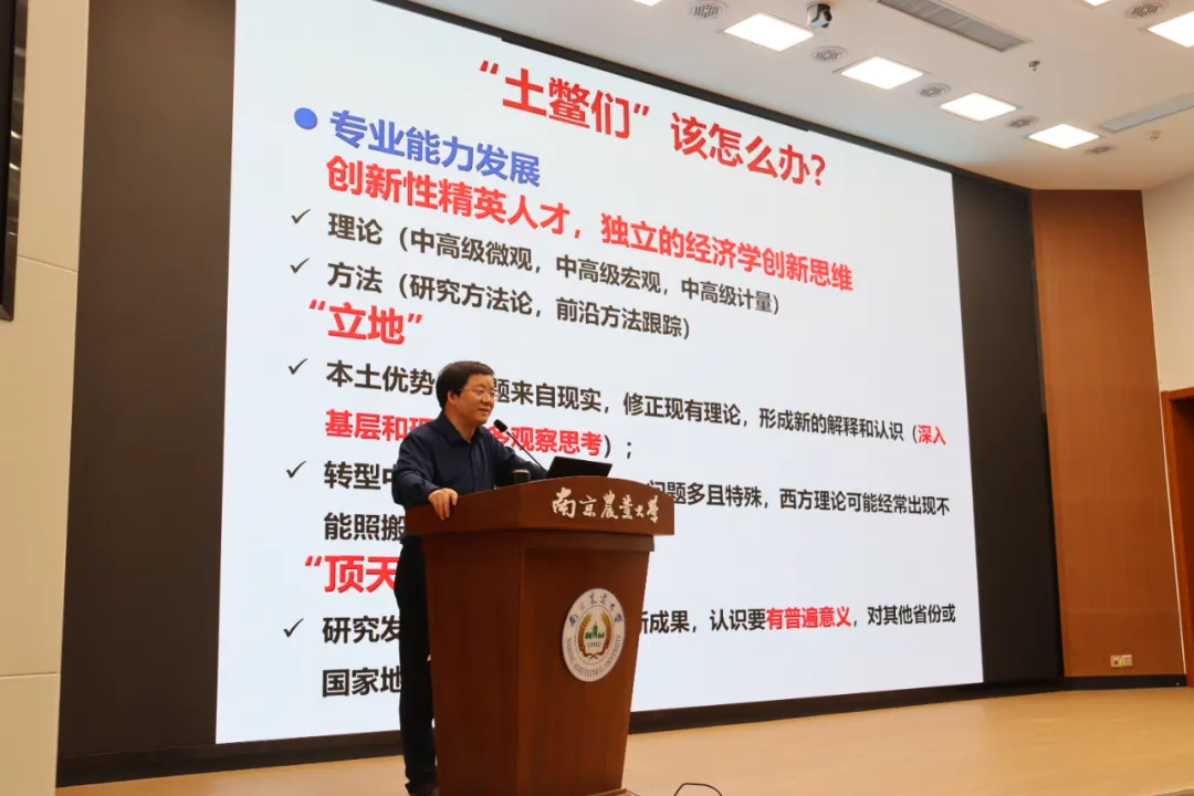 徐志刚以“海龟”和“土鳖”分别比喻国外与国内就读研究生,他指出,面对日益激烈的学术竞争,尽管归国人才数量激增,但“土鳖”学者仍具备独特的本土优势。他鼓励同学们在学术道路上,要弥补理论、方法和语言的短板,扎根我国实际,发挥本土优势,深入基层,将前沿科技与农业生产实践深度融合,产出具有现实意义的研究成果,为培育农业新质生产力注入动能。