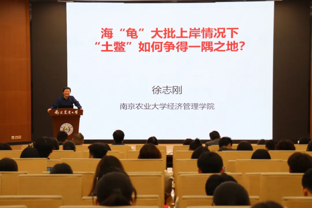 4月7日晚,南京农业大学第十二期“院长讲坛”活动在卫岗校区图书馆报告厅举办,经济管理学院院长徐志刚作“海‘龟’大批上岸,‘土鳖’如何争得一隅之地?——研究生未来发展之路”报告。党委研究生工作部副部长林江辉、经济管理学院党委副书记张树峰、党委研究生工作部路行及200余名学生代表参加本次讲座。