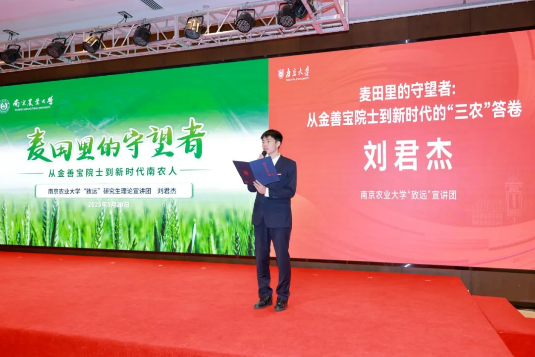 联盟启动仪式结束后,来自省内八所高校的理论宣讲团队围绕“精神如炬,照亮奋进前路”“自立自强,传承报国初心”“向光而行,奔赴理想征程”三个篇章进行示范宣讲,我校宣讲团成员刘君杰作《麦田里的守望者——从金善宝院士到新时代南农人》主题宣讲。