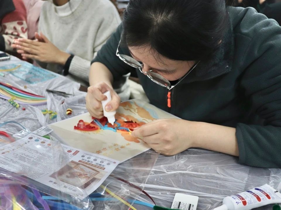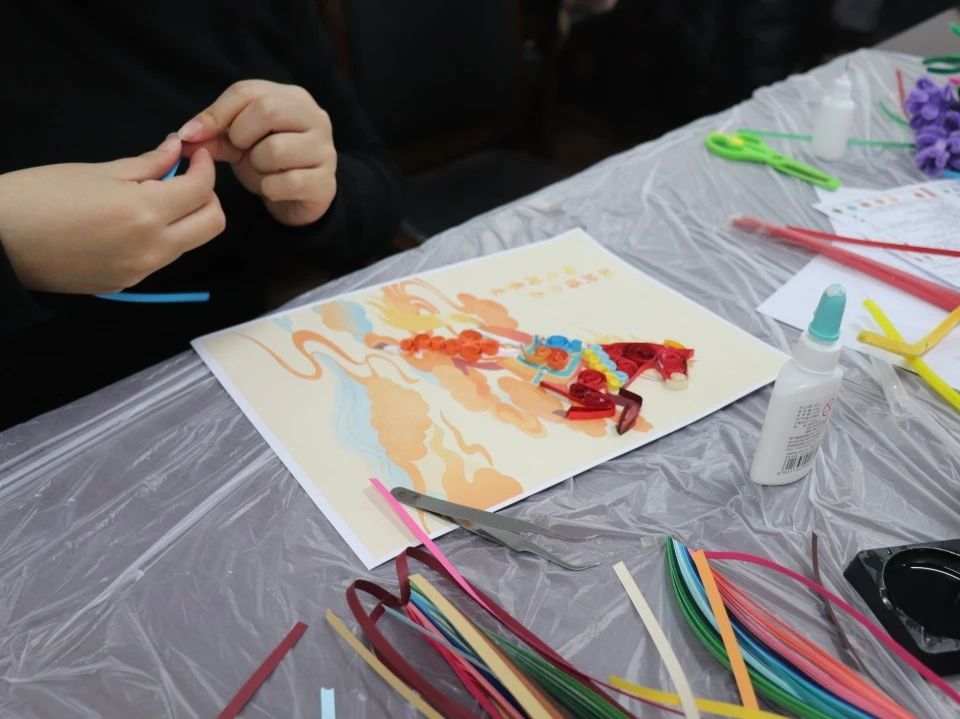 衍纸画制作环节,同学们在工作人员的指导下,熟练运用紧卷、松卷、泪滴卷等技法,将普通的彩纸条转化为立体感十足的“云腾马跃”“马踏祥云”主题作品,在细致创作中体悟非遗文化的独特魅力。