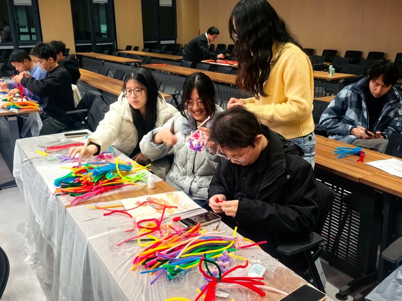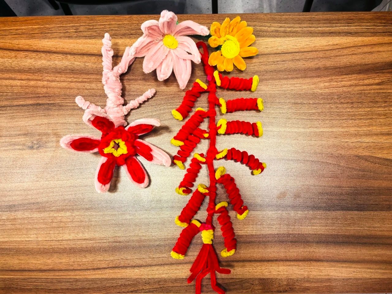 扭扭棒DIY现场创意十足,同学们用色彩斑斓的扭扭棒,经弯折、缠绕、拼接,制作出鞭炮、花朵、小马等各具特色的新年饰品,在动手实践中感受手工创作的乐趣。