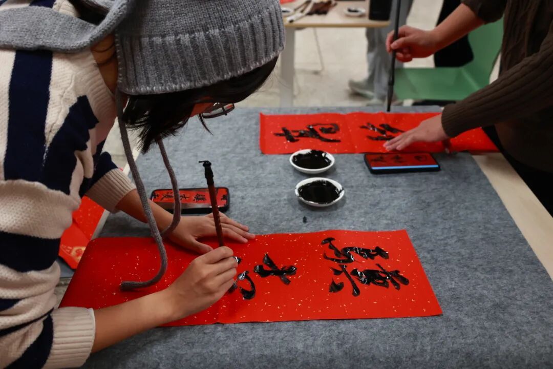 红纸铺展,墨香沁人。书画区内,师生执笔挥毫,将祈福迎祥的殷切期盼落于一副副春联之上。拓印体验则引众人驻足,年画风格的“福”字与灵动的生肖“马”图案,在拓包均匀的扑打下清晰呈现,展现着古老印刷技艺的朴素魅力。更有同学巧妙融合学科特色,将化学分子式、生肖图腾等元素化作春联点饰,让传统形式焕发出属于当代青年的创新表达。方寸红纸间,传递的是绵延千年的文化自信与家国情怀。