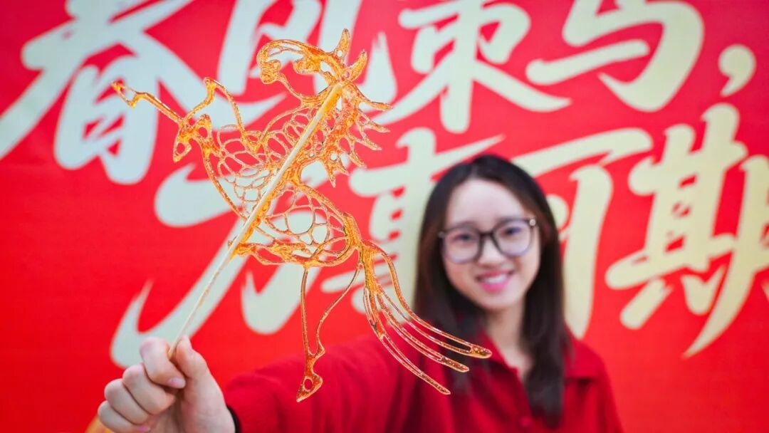 香气缭绕处,是穿越时光的民间技艺。冰糖葫芦摊前,师生亲手串果、蘸糖,重温北方冬日的街头记忆;一旁古法爆米花炉“嘭”声响起,弥漫开记忆深处的年节气息。非遗糖画摊位最是热闹,铜勺为笔,糖液为墨,手腕轻转间,栩栩如生的生肖与吉祥图案便凝于竹签,既是甜美的零食,更是可食用的艺术。梅花糕模具蒸汽袅袅,棉花糖机织出云朵般的絮团——每一味皆承载着农耕文明延续至今的饮食智慧,让年味在舌尖鲜活流淌。