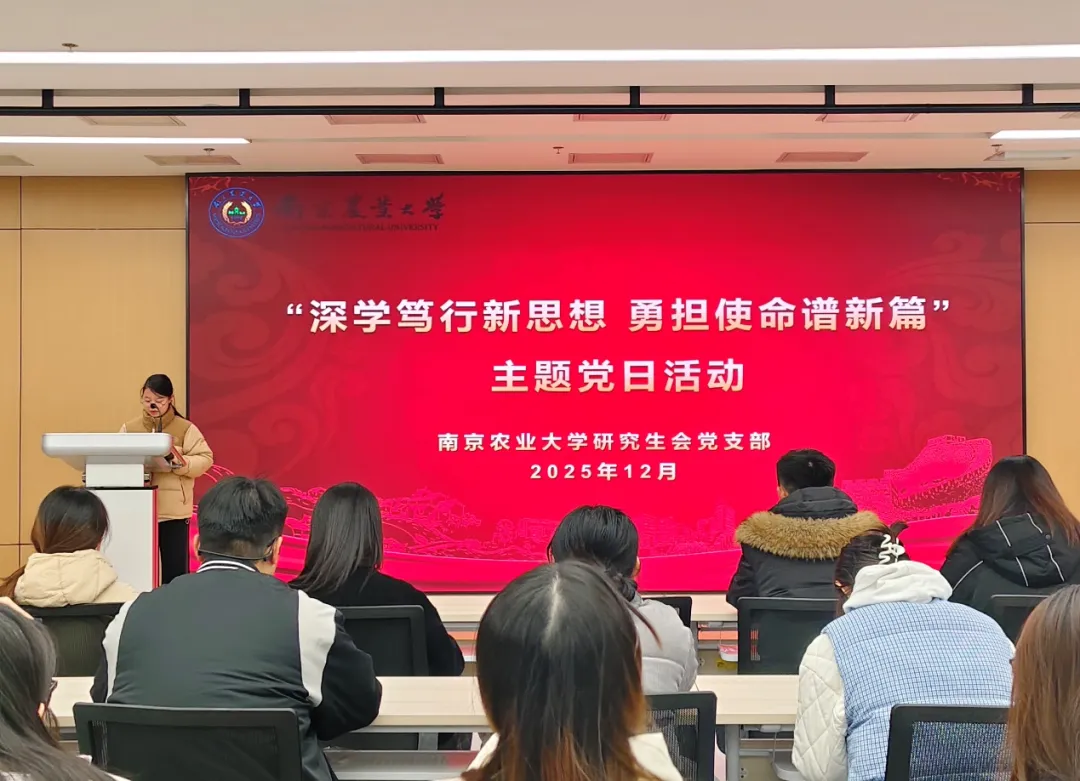 2025年12月15日和12月22日,南京农业大学研究生会党支部在卫岗校区主楼318教室和滨江校区研究生报告厅分别举办了“深学笃行新思想,勇担使命谱新篇”主题党日活动。