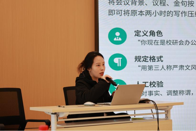 实用办公技能提升培训方面,综合事务中心主任张涵系统讲解了策划案撰写的基本框架与常见问题,新媒体中心主任曹晨旭结合实例,就新闻稿与推文写作展开实务指导。团工委副书记潘星颖聚焦AI赋能研会工作,通过实例演示,讲解了AI对话技巧、实用AI工具与结果优化等实用技巧。