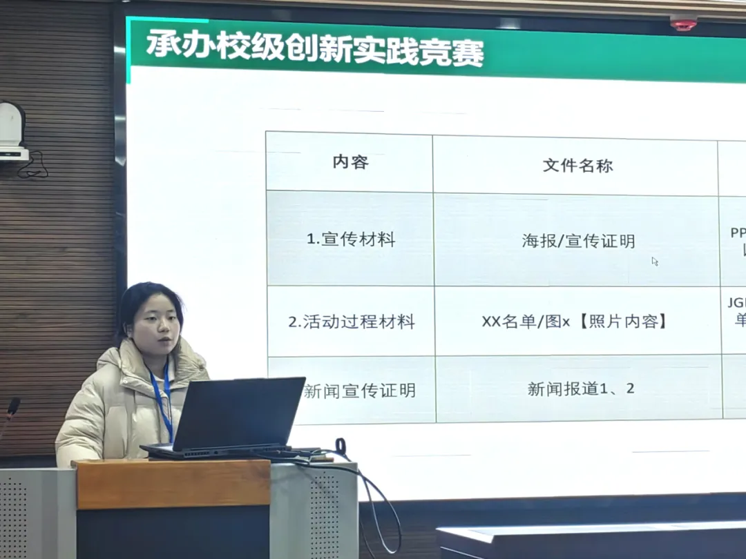会议第三项议程,活动材料规范讲解。科学技术协会主任吴庆帆重点介绍了学术文化活动申请材料、总结材料和创新实践竞赛材料的提交格式和注意事项,旨在推动各类学术文化与创新实践竞赛活动体系化、高效化、高质量开展。